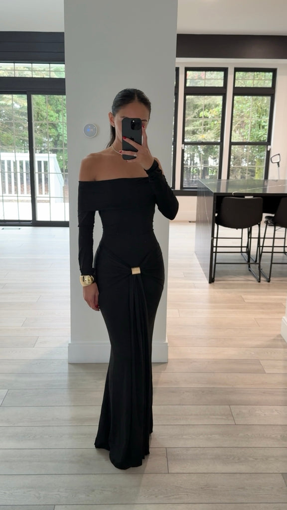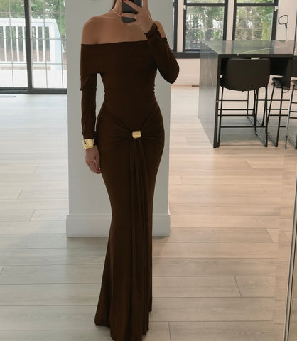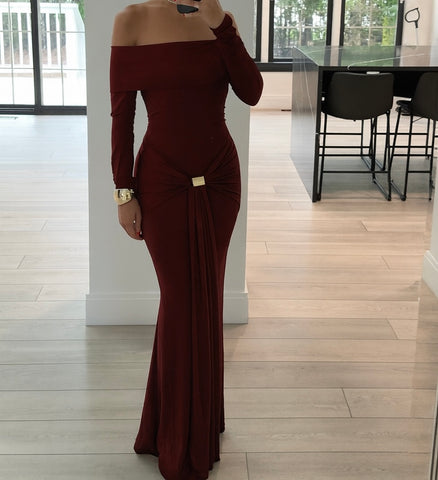 OFF SHOULDER LONG SLEEVE STRETCHY MAXI DRESS