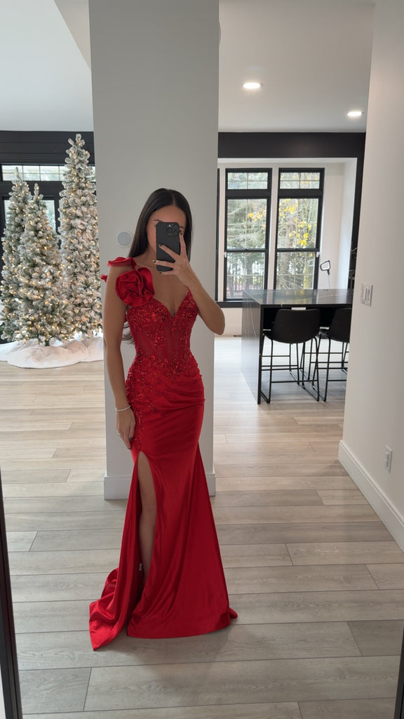 Designed to make an entrance, this fitted gown features a sweetheart neckline with a dramatic sculpted floral shoulder detail for a striking couture moment. The beaded lace bodice glimmers over a sheer corset base, creating dimension and structure. A sleek satin skirt drapes beautifully with delicate ruching and a thigh-high slit, while the lace-up back ensures a flawless, figure-enhancing fit. A show-stopping choice for prom, or glamorous formal events.