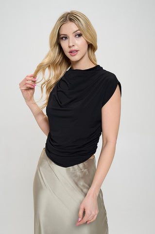 Made in USA Mock neck Short Sleeve Ruched Crop Top. Available in other Colors. Fabric content: 95% Polyester, 5% Spandex.
