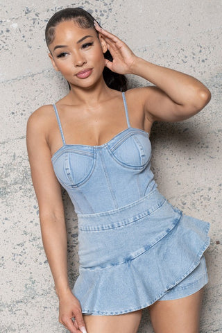 STRETCHY DENIM BODYSUIT WITH PADED BRA CUP, ADJUSTABLE DENIM SPAGUETTI STRAPS W/METAL ZIPPER