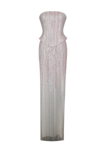 Featuring sculpted princess seams and a softly dipped waistline, the Tosca Dress is designed to flatter with refined elegance and subtle drama. Crafted in a light pink–to–white gradient beaded fabric, this sleeveless sheath-style gown skims the figure beautifully for a sleek, elongated silhouette. A built-in corset provides structure and support, keeping everything perfectly in place throughout the night. Finished with an invisible back zipper for a smooth, seamless fit, this dress is effortlessly polished from every angle. Gracefully stunning and undeniably eye-catching, the Tosca Dress is made to turn heads at prom night, formal evenings, and unforgettable celebrations where sparkle and sophistication go hand in hand.