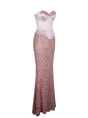 Soft romance meets statement glamour in this Uliya rosy pink strapless mermaid gown, designed to shine all soirée season long. Featuring a sweetheart neckline with a dainty bow detail at the center bust, the bodice is crafted from delicate pink shine satin for a smooth, luminous finish. A peplum-inspired silhouette and dipped waistline create an elegant, flattering shape, enhanced by built-in boning and supportive cups for a secure, sculpted fit. From the hips down, the dress flows into a dramatic mermaid skirt made from beaded floral pink mesh, fully lined for comfort and graceful movement. Finished with an invisible back zipper for a seamless look, this gown is perfect for prom night, formal dances, and any special evening where you want romance, sparkle, and unforgettable entrance energy.