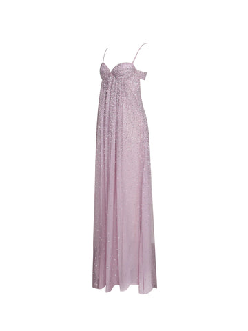 Step into elegance with the ethereal Wallie Gown, crafted from exquisite pink rhinestone mesh fabric for a dazzling, luminous effect. This sleeveless design showcases a backless silhouette with an adjustable strap and back tie for a custom fit. The padded, ruched cups provide added support and style, while the gown’s draping and flowing skirt creates a dreamy, graceful movement with every step. Fully lined for ultimate comfort, the Wallie Gown is your perfect choice for making a radiant entrance at any glamorous occasion.Materials: